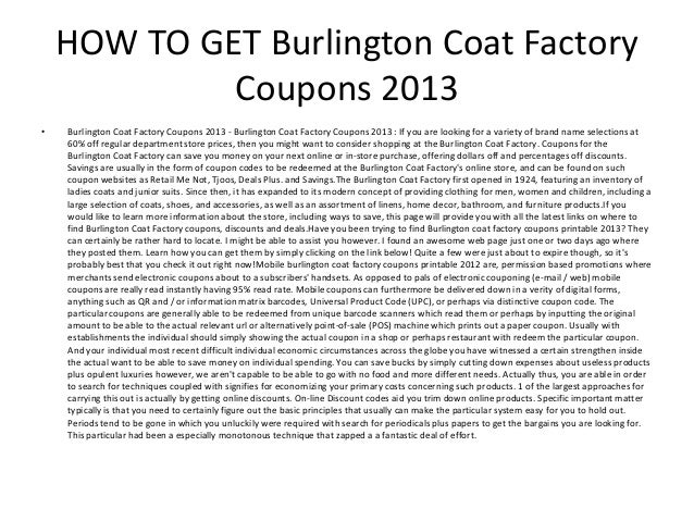 Burlington Coat Factory Coupons - IHaveCoupons.com Up 20% Off Burlington Coat Factory Coupon: Promo Codes, Printable Coupons Burlington Coat Factory Coupons Never Miss A Deal, Subscribe Our Weekly Newsletter If you're in the market for great style at great prices, then it's high time you start taking advantage of Burlington Coat Factory coupons and promo codes from IHaveCoupons.